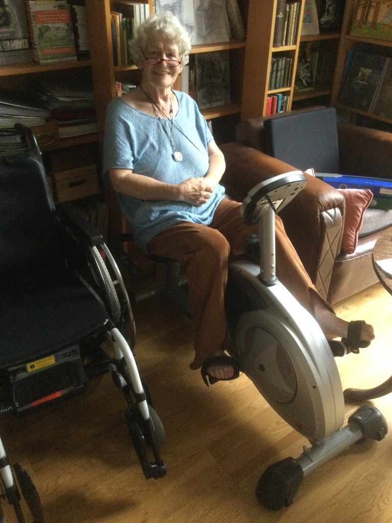 Ich stelle mir kurze Videos auf meinem IPad ein, ca 20 Minuten, denn dann bleibe ich sitzen. Mein Trick: Wenn der Alltagsbetreuer da ist, muss ich auf dem Rad sitzen bleiben, solange er saugt und wischt.