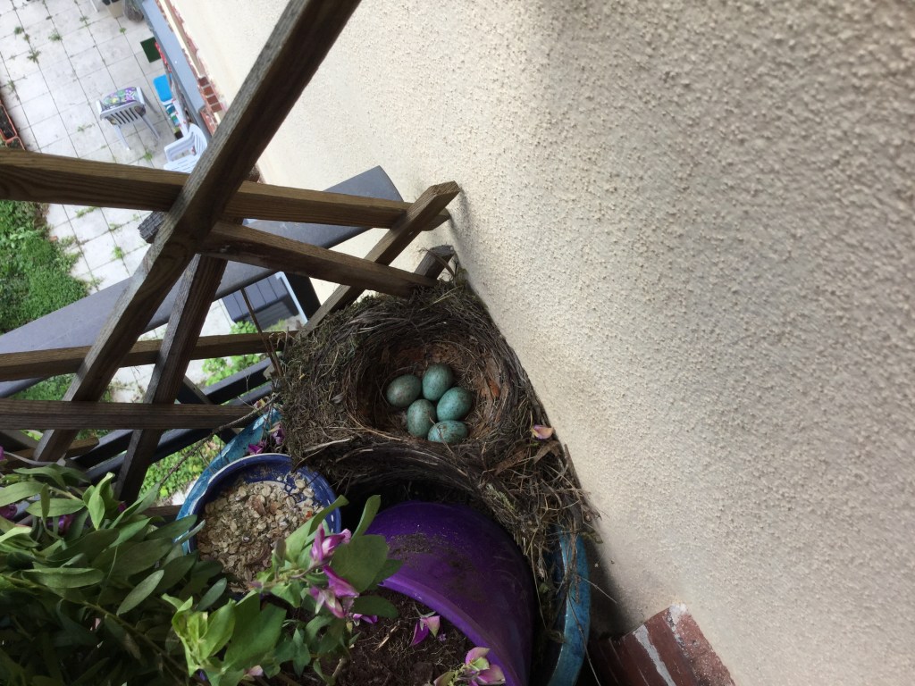 Vor drei Jahren, war einige Tage regnerisches Wetter. Als ich dann endlich auf dem Balkon sitzen wollte, hatte eine Amsel in diesen Tagen ein Nest gebaut und darin lagen fünf Eier.